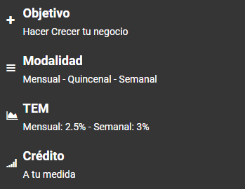Si tienes un negocio, pero actualmente no tienes el capital que necesitas, no te preocupes, nosotros te prestamos el dinero que necesitas para hacer crecer tu negocio y ganar el dinero que tienes en mente. Tú decides cuanto quieres pagar, como quieres pagar, y nosotros te alcanzamos las alternativas.